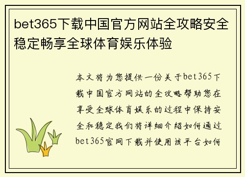 本文将为您提供一份关于bet365下载中国官方网站的全攻略,帮助您在享受全球体育娱乐的过程中保持安全和稳定。我们将详细介绍如何通过bet365官网下载并使用该平台,如何确保在使用过程中获得最佳体验,如何选择合适的体育项目以及如何最大化平台提供的各种娱乐服务。通过这篇文章,您不仅能全面了解bet365下载中国官方网站的使用方法,还能在平台上享受到全球体育娱乐的乐趣。