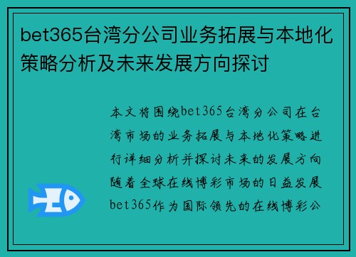 本文将围绕bet365台湾分公司在台湾市场的业务拓展与本地化策略进行详细分析,并探讨未来的发展方向。随着全球在线博彩市场的日益发展,bet365作为国际领先的在线博彩公司,在台湾的业务布局不仅面临着激烈的市场竞争,还需考虑到本地文化与法规的复杂性。本篇文章从市场环境分析、品牌本地化策略、产品本地化设计、以及合规与监管环境等四个方面,深入探讨bet365在台湾的战略布局及其面临的机遇与挑战。最后,文章将对bet365在台湾的未来发展方向做出预判,并对整体策略进行总结。