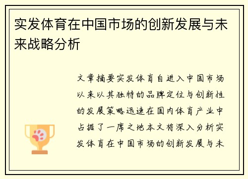 实发体育自进入中国市场以来,以其独特的品牌定位与创新性的发展策略,迅速在国内体育产业中占据了一席之地。本文将深入分析实发体育在中国市场的创新发展与未来战略,通过四个方面的细致探讨,全面展现其在行业内的领先地位。首先,实发体育通过不断的技术创新与产品升级,成功打造了多元化的产品矩阵,满足了不同消费者的需求;其次,实发体育加强了与体育生态圈的合作,通过跨界合作与资源整合,推动了品牌的快速增长;再次,实发体育着眼于数字化转型,利用大数据、人工智能等技术,提升了用户体验与运营效率;最后,实发体育也在市场营销与品牌传播上采取了独特的战略,增强了品牌的市场渗透力和用户黏性。通过这些创新举措,实发体育不仅在中国市场取得了显著成绩,也为未来的发展奠定了坚实基础。